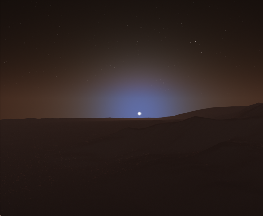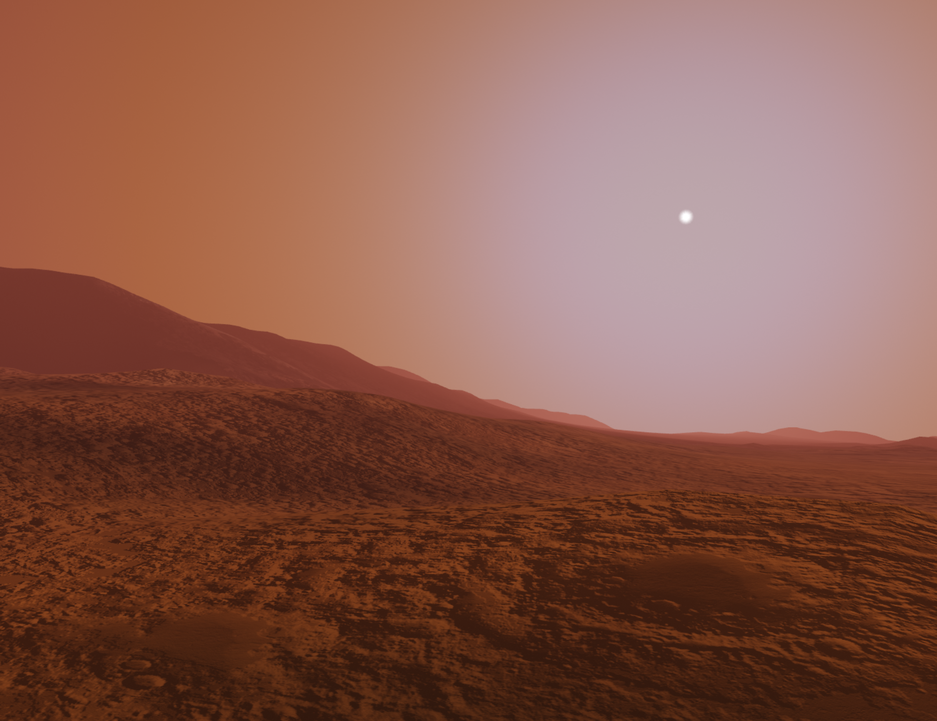 Developing a realistic Martian environment required Diamond Visionics to solve complex atmospheric and geological problems. Unlike Earth, where Rayleigh scattering creates a blue sky, the Martian atmosphere is thin and dominated by dust. “We were successful in creating a physics-based atmospheric model to properly represent Mars,” said Daniel Peters, Sales Manager at Diamond Visionics. “Because Martian air is thin and filled with fine grained hematite, the daytime sky is typically a red-orange color. However, during dawn and dusk, the GenesisMars atmospheric scattering model creates the unique blue halo around the sun phenomenon by mathematically accounting for the hematite content in Martian dust.”