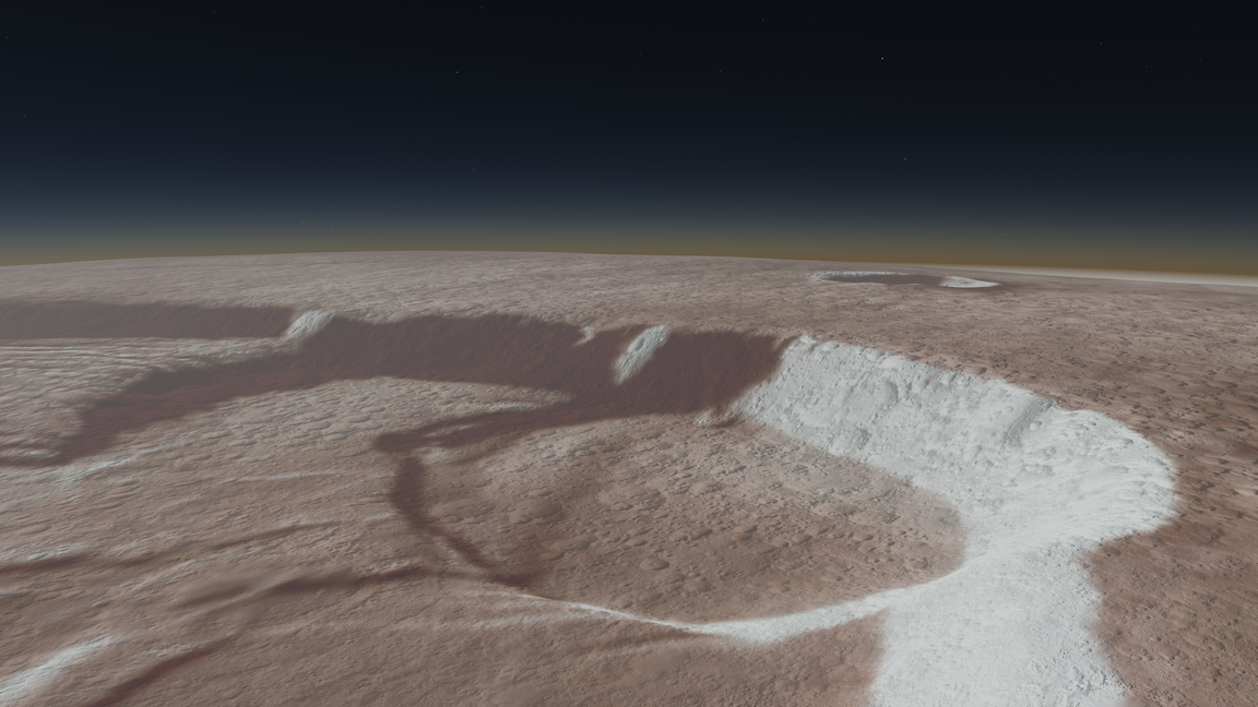 Developing a realistic Martian environment required Diamond Visionics to solve complex atmospheric and geological problems. Unlike Earth, where Rayleigh scattering creates a blue sky, the Martian atmosphere is thin and dominated by dust. “We were successful in creating a physics-based atmospheric model to properly represent Mars,” said Daniel Peters, Sales Manager at Diamond Visionics. “Because Martian air is thin and filled with fine grained hematite, the daytime sky is typically a red-orange color. However, during dawn and dusk, the GenesisMars atmospheric scattering model creates the unique blue halo around the sun phenomenon by mathematically accounting for the hematite content in Martian dust.”